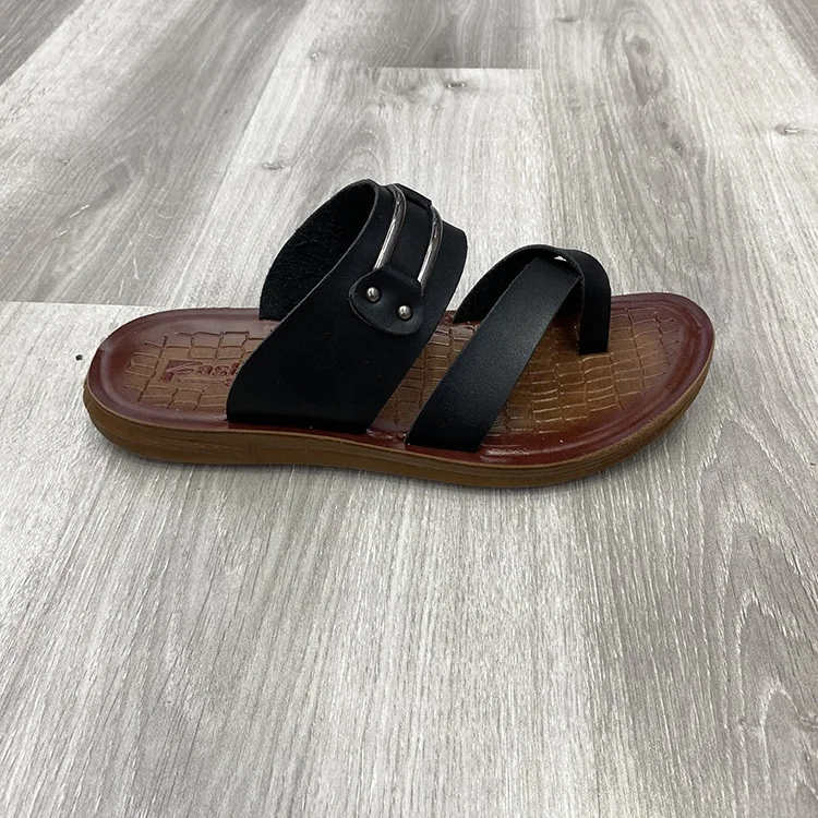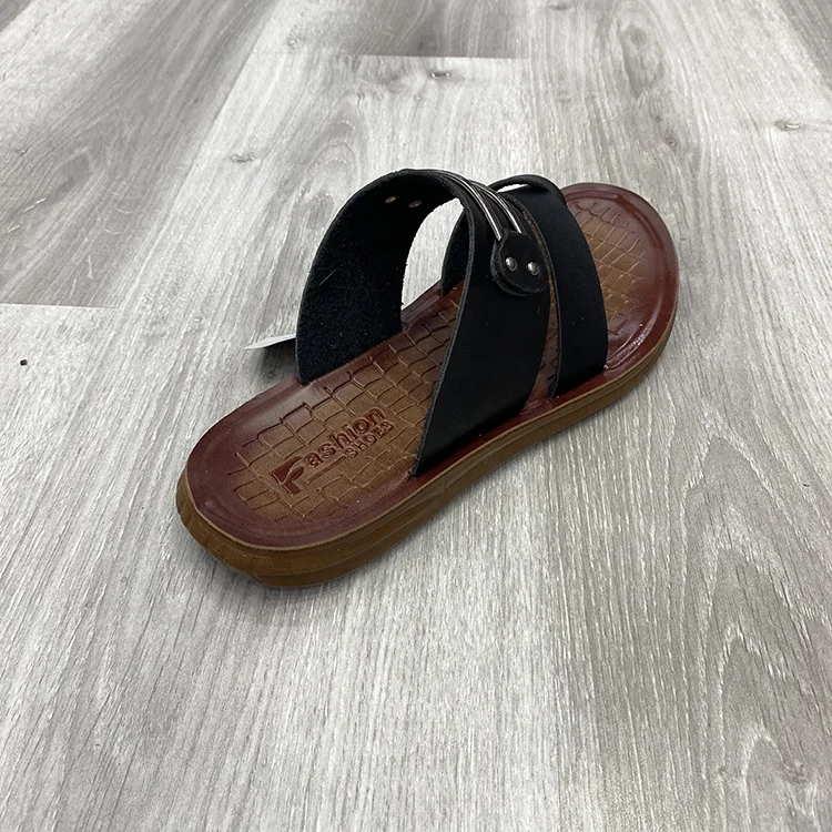 Rectangular metal buckle slippers men's black flip flops slippers stone pattern insole men's PU leather slippers